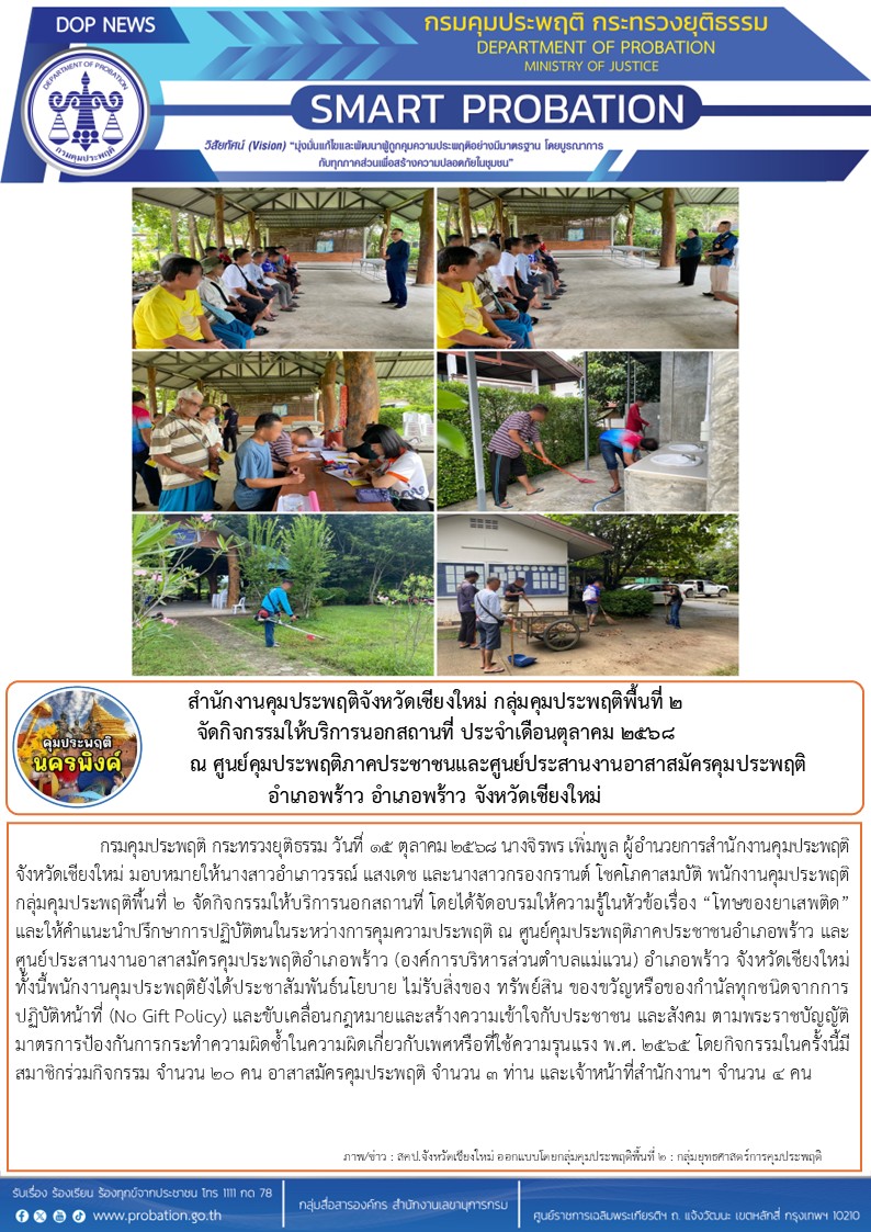 วันที่ 15 ตุลาคม 2568 นางจิรพร เพิ่มพูล ผู้อำนวยการสำนักงานคุมประพฤติจังหวัดเชียงใหม่ มอบหมายให้นางสาวอำเภาวรรณ์ แสงเดช และนางสาวกรองกรานต์ โชคโภคาสมบัติ พนักงานคุมประพฤติ กลุ่มคุมประพฤติพื้นที่ 2 จัดกิจกรรมให้บริการนอกสถานที่ โดยได้จัดอบรมให้ความรู้ในหัวข้อเรื่อง "โทษของยาเสพติด" และให้คำแนะนำปรึกษาการปฏิบัติตนในระหว่างการคุมความประพฤติ ณ ศูนย์คุมประพฤติภาคประชาชนอำเภอพร้าว และศูนย์ประสานงานอาสาสมัครคุมประพฤติอำเภอพร้าว (องค์การบริหารส่วนตำบลแม่แวน) อำเภอพร้าว จังหวัดเชียงใหม่ ทั้งนี้พนักงานคุมประพฤติยังได้ประชาสัมพันธ์นโยบาย ไม่รับสิ่งของ ทรัพย์สิน ของขวัญหรือของกำนัลทุกชนิดจากการปฏิบัติหน้าที่ (No Gift Policy) และขับเคลื่อนกฎหมายและสร้างความเข้าใจกับประชาชน และสังคม ตามพระราชบัญญัติมาตรการป้องกันการกระทำความผิดซ้ำในความผิดเกี่ยวกับเพศหรือที่ใช้ความรุนแรง พ.ศ. 2565 โดยกิจกรรมในครั้งนี้มีสมาชิกร่วมกิจกรรม จำนวน 20 คน อาสาสมัครคุมประพฤติ จำนวน 3 ท่าน และเจ้าหน้าที่สำนักงานฯ จำนวน 4 คน