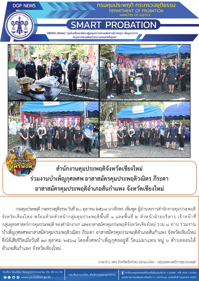 วันที่ 20 ตุลาคม 2568 นางจิรพร เพิ่มพูล ผู้อำนวยการสำนักงานคุมประพฤติจังหวัดเชียงใหม่ พร้อมด้วยหัวหน้ากลุ่มคุมประพฤติพื้นที่ 1 และพื้นที่ 2 หัวหน้าฝ่ายบริหาร เจ้าหน้าที่กลุ่มยุทธศาสตร์การคุมประพฤติ ของสำนักงานฯ และอาสาสมัครคุมประพฤติจังหวัดเชียงใหม่ รวม 8 ท่าน ร่วมงานบำเพ็ญกุศลศพอาสาสมัครคุมประพฤติวณิตร ภีระตา อาสาสมัครคุมประพฤติอำเภอสันกำแพง จังหวัดเชียงใหม่ ซึ่งได้เสียชีวิตเมื่อวันที่ 19 ตุลาคม 2568 โดยตั้งศพบำเพ็ญกุศลอยู่ที่ วัดแม่ผาแหน หมู่ 6 ตำบลออนใต้ อำเภอสันกำแพง จังหวัดเชียงใหม่
