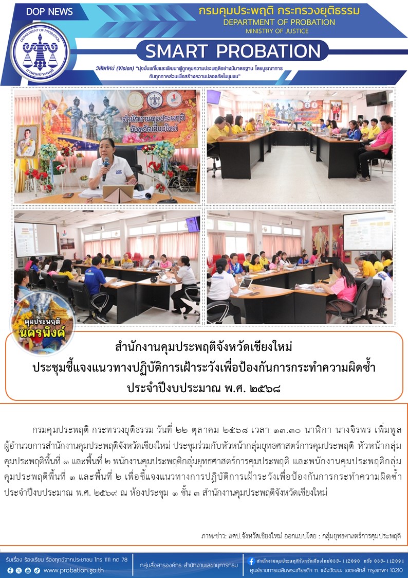 วันที่ 22 ตุลาคม 2568 เวลา 13.30 นาฬิกา นางจิรพร เพิ่มพูล ผู้อำนวยการสำนักงานคุมประพฤติจังหวัดเชียงใหม่ ประชุมร่วมกับหัวหน้ากลุ่มยุทธศาสตร์การคุมประพฤติ หัวหน้ากลุ่มคุมประพฤติพื้นที่ 1 และพื้นที่ 2 พนักงานคุมประพฤติกลุ่มยุทธศาสตร์การคุมประพฤติ และพนักงานคุมประพฤติกลุ่มคุมประพฤติพื้นที่ 1 และพื้นที่ 2 เพื่อชี้แจงแนวทางการปฏิบัติการเฝ้าระวังเพื่อป้องกันการกระทำความผิดซ้ำ ประจำปีงบประมาณ พ.ศ. 2569 ณ ห้องประชุม 1 ชั้น 3 สำนักงานคุมประพฤติจังหวัดเชียงใหม่