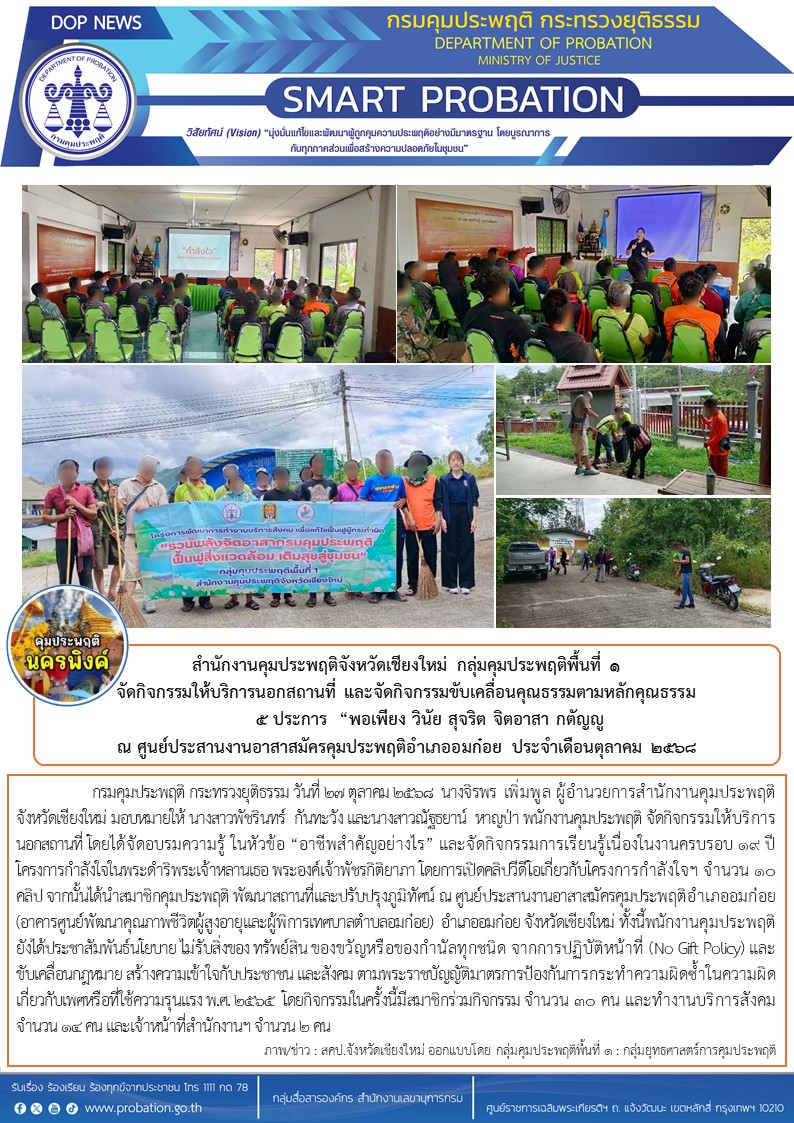 วันที่ 27 ตุลาคม 2568 นางจิรพร เพิ่มพูล ผู้อำนวยการสำนักงานคุมประพฤติจังหวัดเชียงใหม่ มอบหมายให้ นางสาวพัชรินทร์ กันทะวัง และนางสาวณัฐธยาน์ หาญป่า พนักงานคุมประพฤติ จัดกิจกรรมให้บริการนอกสถานที่ โดยได้จัดอบรมความรู้ ในหัวข้อ "อาชีพสำคัญอย่างไร" และจัดกิจกรรมการเรียนรู้เนื่องในงานครบรอบ 19 ปี โครงการกำลังใจในพระดำริพระเจ้าหลานเธอ พระองค์เจ้าพัชรกิติยาภา โดยการเปิดคลิปวีดีโอเกี่ยวกับโครงการกำลังใจฯ จำนวน 10 คลิป จากนั้นได้นำสมาชิกคุมประพฤติ พัฒนาสถานที่และปรับปรุงภูมิทัศน์ ณ ศูนย์ประสานงานอาสาสมัครคุมประพฤติอำเภออมก๋อย (อาคารศูนย์พัฒนาคุณภาพชีวิตผู้สูงอายุและผู้พิการเทศบาลตำบลอมก๋อย) อำเภออมก๋อย จังหวัดเชียงใหม่ ทั้งนี้พนักงานคุมประพฤติยังได้ประชาสัมพันธ์นโยบาย ไม่รับสิ่งของ ทรัพย์สิน ของขวัญหรือของกำนัลทุกชนิด จากการปฏิบัติหน้าที่ (No Gift Policy) และขับเคลื่อนกฎหมาย สร้างความเข้าใจกับประชาชน และสังคม ตามพระราชบัญญัติมาตรการป้องกันการกระทำความผิดซ้ำในความผิดเกี่ยวกับเพศหรือที่ใช้ความรุนแรง พ.ศ. 2565 โดยกิจกรรมในครั้งนี้มีสมาชิกร่วมกิจกรรม จำนวน 30 คน และทำงานบริการสังคม จำนวน 14 คน และเจ้าหน้าที่สำนักงานฯ จำนวน 2 คน