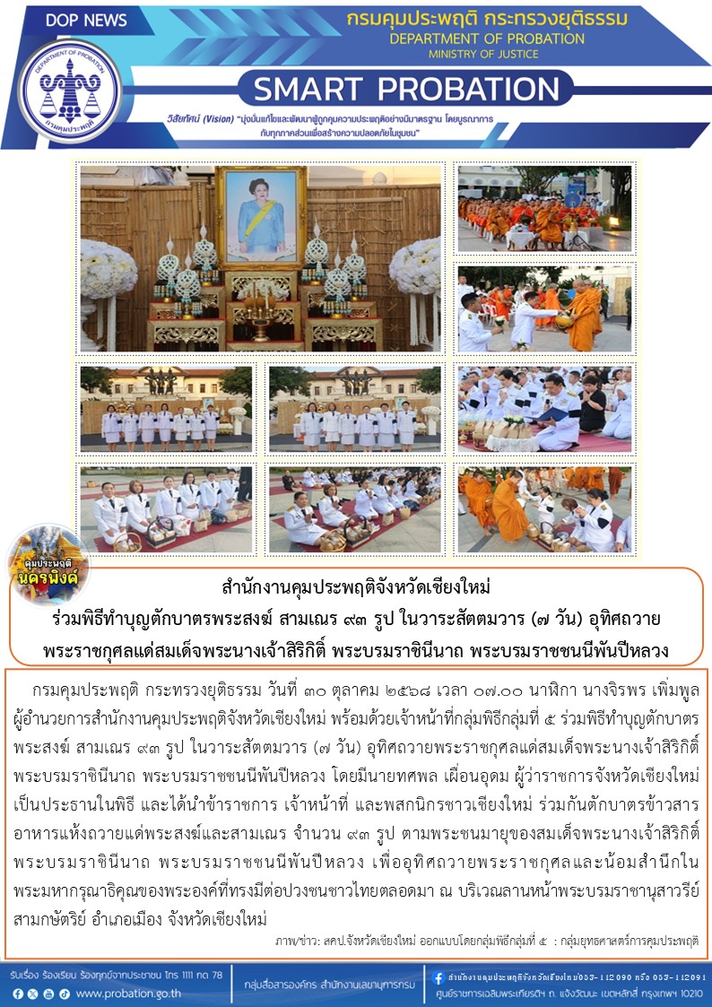 วันที่ 30 ตุลาคม 2568 เวลา 07.00 นาฬิกา นางจิรพร เพิ่มพูล ผู้อำนวยการสำนักงานคุมประพฤติจังหวัดเชียงใหม่ พร้อมด้วยเจ้าหน้าที่กลุ่มพิธีกลุ่มที่ 5 ร่วมพิธีทำบุญตักบาตรพระสงฆ์ สามเณร 93 รูป ในวาระสัตตมวาร (7 วัน) อุทิศถวายพระราชกุศลแด่สมเด็จพระนางเจ้าสิริกิติ์ พระบรมราชินีนาถ พระบรมราชชนนีพันปีหลวง โดยมีนายทศพล เผื่อนอุดม ผู้ว่าราชการจังหวัดเชียงใหม่ เป็นประธานในพิธี และได้นำข้าราชการ เจ้าหน้าที่ และพสกนิกรชาวเชียงใหม่ ร่วมกันตักบาตรข้าวสารอาหารแห้งถวายแด่พระสงฆ์และสามเณร จำนวน 93 รูป ตามพระชนมายุของสมเด็จพระนางเจ้าสิริกิติ์ พระบรมราชินีนาถ พระบรมราชชนนีพันปีหลวง เพื่ออุทิศถวายพระราชกุศลและน้อมสำนึกในพระมหากรุณาธิคุณของพระองค์ที่ทรงมีต่อปวงชนชาวไทยตลอดมา ณ บริเวณลานหน้าพระบรมราชานุสาวรีย์สามกษัตริย์ อำเภอเมือง จังหวัดเชียงใหม่
