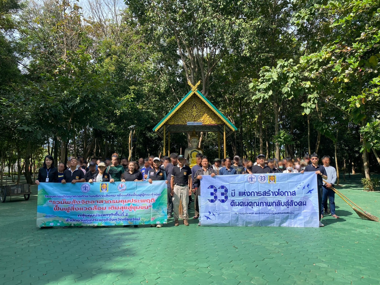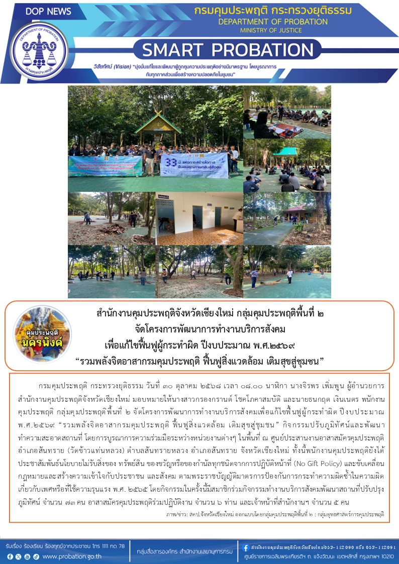 วันที่ 30 ตุลาคม 2568 เวลา 08.00 นาฬิกา นางจิรพร เพิ่มพูน ผู้อำนวยการสำนักงานคุมประพฤติจังหวัดเชียงใหม่ มอบหมายให้นางสาวกรองกรานต์ โชคโภคาสมบัติ และนายธนกฤต เงินเนตร พนักงานคุมประพฤติ กลุ่มคุมประพฤติพื้นที่ 2 จัดโครงการพัฒนาการทำงานบริการสังคมเพื่อแก้ไขฟื้นฟูผู้กระทำผิด ปีงบประมาณ พ.ศ.2569 "รวมพลังจิตอาสากรมคุมประพฤติ ฟื้นฟูสิ่งแวดล้อม เติมสุขสู่ชุมชน" กิจกรรมปรับภูมิทัศน์และพัฒนาทำความสะอาดสถานที่ โดยการบูรณาการความร่วมมือระหว่างหน่วยงานต่างๆ ในพื้นที่ ณ ศูนย์ประสานงานอาสาสมัครคุมประพฤติอำเภอสันทราย (วัดข้าวแท่นหลวง) ตำบลสันทรายหลวง อำเภอสันทราย จังหวัดเชียงใหม่ ทั้งนี้พนักงานคุมประพฤติยังได้ประชาสัมพันธ์นโยบายไม่รับสิ่งของ ทรัพย์สิน ของขวัญหรือของกำนัลทุกชนิดจากการปฏิบัติหน้าที่ (No Gift Policy) และขับเคลื่อนกฎหมายและสร้างความเข้าใจกับประชาชน และสังคม ตามพระราชบัญญัติมาตรการป้องกันการกระทำความผิดซ้ำในความผิดเกี่ยวกับเพศหรือที่ใช้ความรุนแรง พ.ศ. 2565 โดยกิจกรรมในครั้งนี้มีสมาชิกร่วมกิจกรรมทำงานบริการสังคมพัฒนาสถานที่ปรับปรุงภูมิทัศน์ จำนวน 73 คน อาสาสมัครคุมประพฤติร่วมปฏิบัติงาน จำนวน 6 ท่าน และเจ้าหน้าที่สำนักงานฯ จำนวน 5 คน