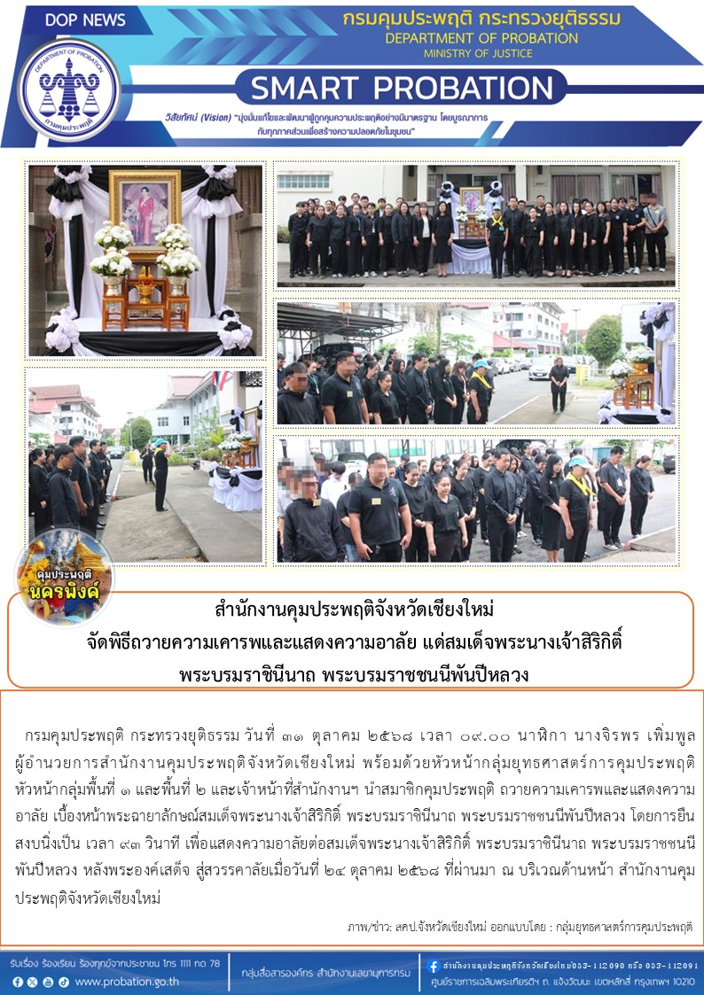 วันที่ 31 ตุลาคม 2568 เวลา 09.00 นาฬิกา นางจิรพร เพิ่มพูล ผู้อำนวยการสำนักงานคุมประพฤติจังหวัดเชียงใหม่ พร้อมด้วยหัวหน้ากลุ่มยุทธศาสตร์การคุมประพฤติ หัวหน้ากลุ่มพื้นที่ 1 และพื้นที่ 2 และเจ้าหน้าที่สำนักงานฯ นำสมาชิกคุมประพฤติ ถวายความเคารพและแสดงความอาลัย เบื้องหน้าพระฉายาลักษณ์สมเด็จพระนางเจ้าสิริกิติ์ พระบรมราชินีนาถ พระบรมราชชนนีพันปีหลวง โดยการยืนสงบนิ่งเป็น เวลา 93 วินาที เพื่อแสดงความอาลัยต่อสมเด็จพระนางเจ้าสิริกิติ์ พระบรมราชินีนาถ พระบรมราชชนนีพันปีหลวง หลังพระองค์เสด็จ สู่สวรรคาลัยเมื่อวันที่ 24 ตุลาคม 2568 ที่ผ่านมา ณ บริเวณด้านหน้า สำนักงานคุมประพฤติจังหวัดเชียงใหม่