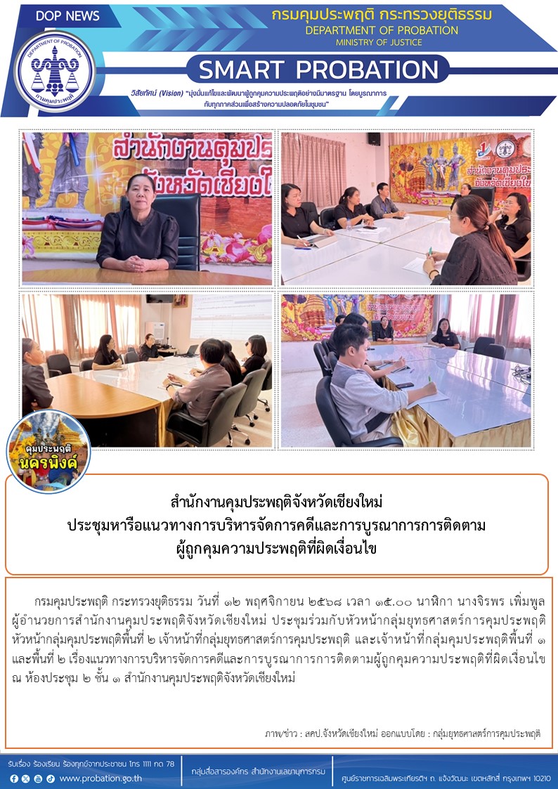 วันที่ 12 พฤศจิกายน 2568 เวลา 15.00 นาฬิกา นางจิรพร เพิ่มพูล ผู้อำนวยการสำนักงานคุมประพฤติจังหวัดเชียงใหม่ ประชุมร่วมกับหัวหน้ากลุ่มยุทธศาสตร์การคุมประพฤติ หัวหน้ากลุ่มคุมประพฤติพื้นที่ 2 เจ้าหน้าที่กลุ่มยุทธศาสตร์การคุมประพฤติ และเจ้าหน้าที่กลุ่มคุมประพฤติพื้นที่ 1 และพื้นที่ 2 เรื่องแนวทางการบริหารจัดการคดีและการบูรณาการการติดตามผู้ถูกคุมความประพฤติที่ผิดเงื่อนไข ณ ห้องประชุม 2 ชั้น 1 สำนักงานคุมประพฤติจังหวัดเชียงใหม่