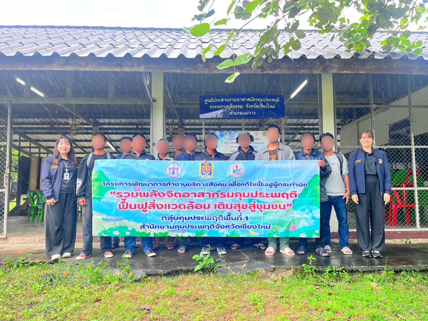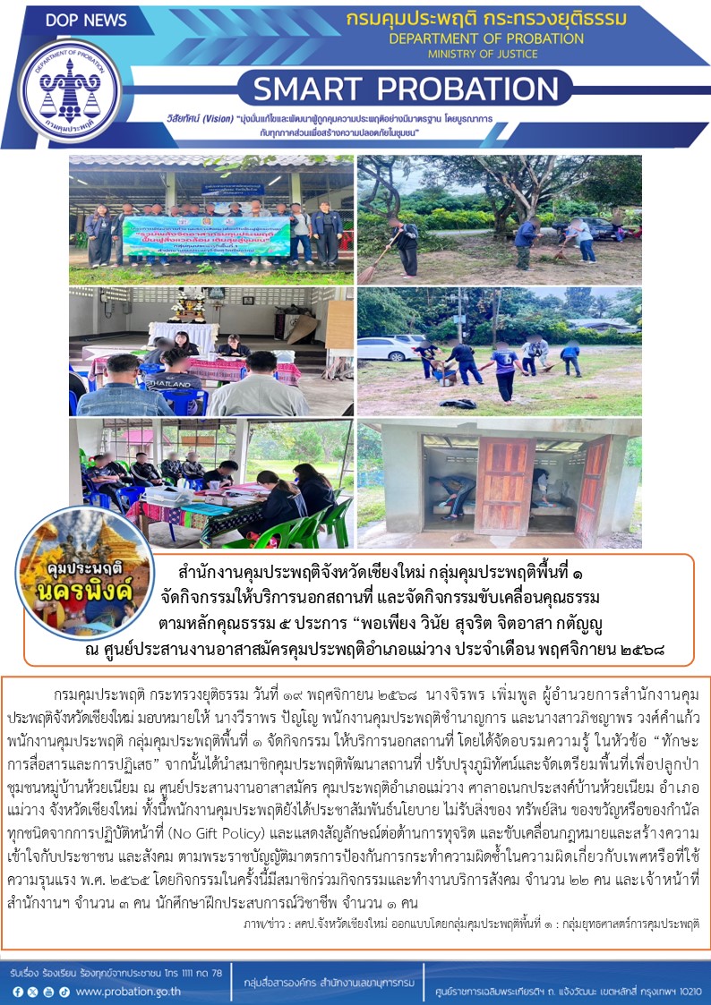 วันที่ 19 พฤศจิกายน 2568 นางจิรพร เพิ่มพูล ผู้อำนวยการสำนักงานคุมประพฤติจังหวัดเชียงใหม่ มอบหมายให้ นางวีราพร ปัญโญ พนักงานคุมประพฤติชํานาญการ และนางสาวภิชญาพร วงศ์คำแก้ว พนักงานคุมประพฤติ กลุ่มคุมประพฤติพื้นที่ 1 จัดกิจกรรม ให้บริการนอกสถานที่ โดยได้จัดอบรมความรู้ ในหัวข้อ "ทักษะการสื่อสารและการปฏิเสธ" จากนั้นได้นำสมาชิกคุมประพฤติพัฒนาสถานที่ ปรับปรุงภูมิทัศน์และจัดเตรียมพื้นที่เพื่อปลูกป่าชุมชนหมู่บ้านห้วยเนียม ณ ศูนย์ประสานงานอาสาสมัคร คุมประพฤติอำเภอแม่วาง ศาลาอเนกประสงค์บ้านห้วยเนียม อำเภอแม่วาง จังหวัดเชียงใหม่ ทั้งนี้พนักงานคุมประพฤติยังได้ประชาสัมพันธ์นโยบาย ไม่รับสิ่งของ ทรัพย์สิน ของขวัญหรือของกำนัลทุกชนิดจากการปฏิบัติหน้าที่ (No Gift Policy) และแสดงสัญลักษณ์ต่อต้านการทุจริต และขับเคลื่อนกฎหมายและสร้างความเข้าใจกับประชาชน และสังคม ตามพระราชบัญญัติมาตรการป้องกันการกระทำความผิดซ้ำในความผิดเกี่ยวกับเพศหรือที่ใช้ความรุนแรง พ.ศ. 2565 โดยกิจกรรมในครั้งนี้มีสมาชิกร่วมกิจกรรมและทำงานบริการสังคม จำนวน 22 คน และเจ้าหน้าที่สำนักงานฯ จำนวน 3 คน นักศึกษาฝึกประสบการณ์วิชาชีพ จำนวน 1 คน