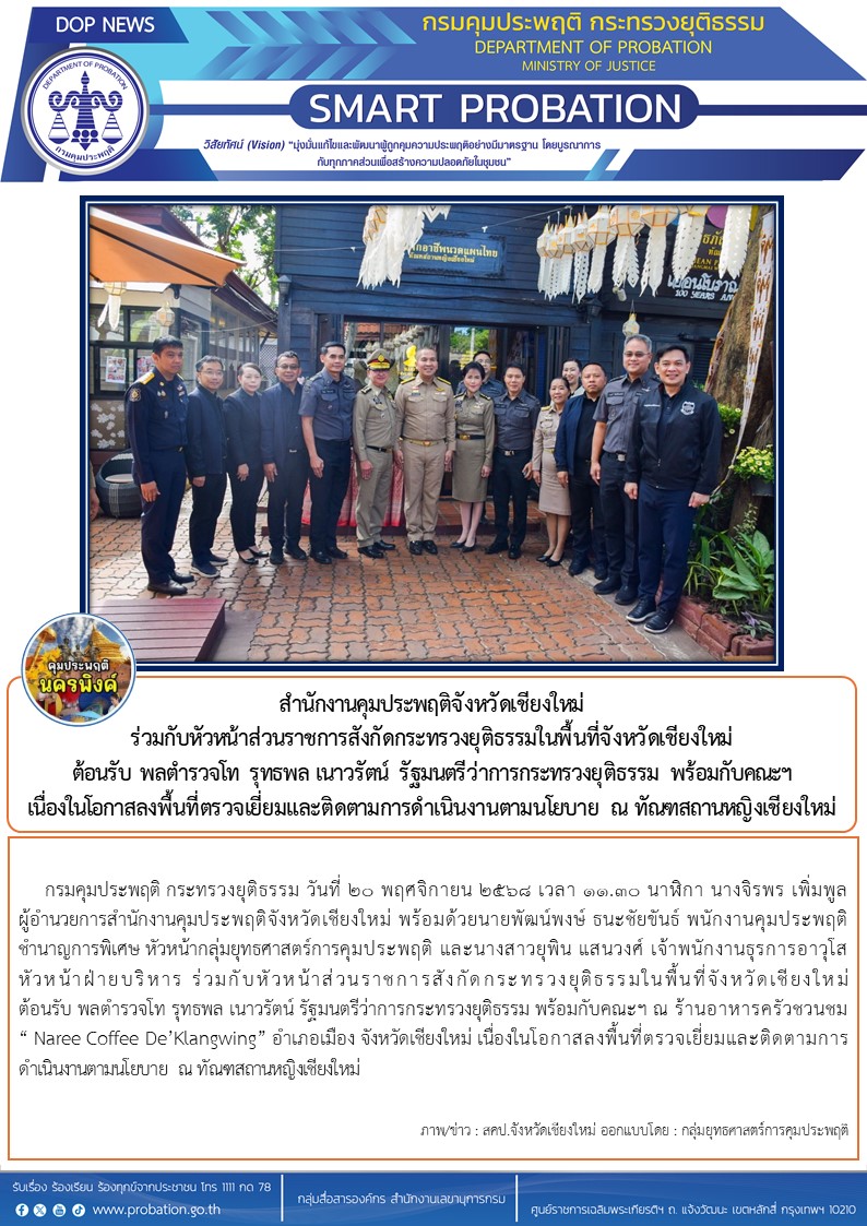 วันที่ 20 พฤศจิกายน 2568 เวลา 11.30 นาฬิกา นางจิรพร เพิ่มพูล ผู้อำนวยการสำนักงานคุมประพฤติจังหวัดเชียงใหม่ พร้อมด้วยนายพัฒน์พงษ์ ธนะชัยขันธ์ พนักงานคุมประพฤติชำนาญการพิเศษ หัวหน้ากลุ่มยุทธศาสตร์การคุมประพฤติ และนางสาวยุพิน แสนวงศ์ เจ้าพนักงานธุรการอาวุโส หัวหน้าฝ่ายบริหาร ร่วมกับหัวหน้าส่วนราชการสังกัดกระทรวงยุติธรรมในพื้นที่จังหวัดเชียงใหม่ ต้อนรับ พลตำรวจโท รุทธพล เนาวรัตน์ รัฐมนตรีว่าการกระทรวงยุติธรรม พร้อมกับคณะฯ ณ ร้านอาหารครัวชวนชม " Naree Coffee De'Klangwing" อำเภอเมือง จังหวัดเชียงใหม่ เนื่องในโอกาสลงพื้นที่ตรวจเยี่ยมและติดตามการดำเนินงานตามนโยบาย ณ ทัณฑสถานหญิงเชียงใหม่