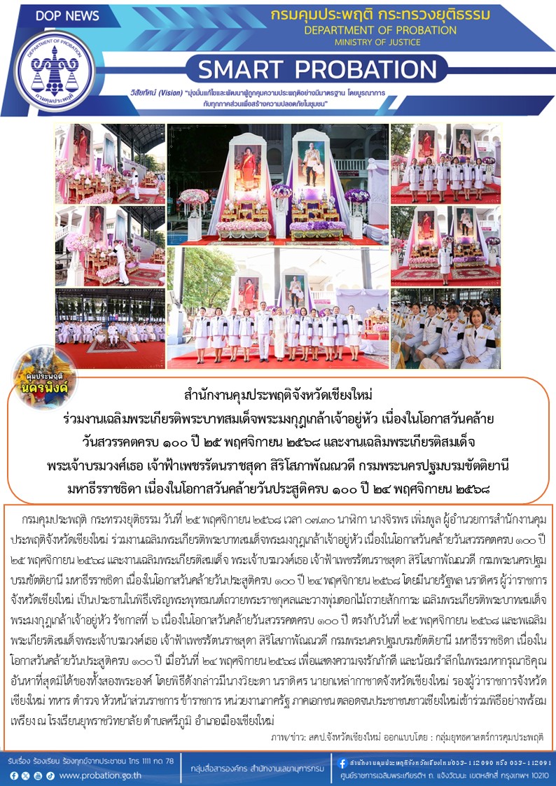วันที่ 25 พฤศจิกายน 2568 เวลา 07.30 นาฬิกา นางจิรพร เพิ่มพูล ผู้อำนวยการสำนักงานคุมประพฤติจังหวัดเชียงใหม่ ร่วมงานเฉลิมพระเกียรติพระบาทสมเด็จพระมงกุฎเกล้าเจ้าอยู่หัว เนื่องในโอกาสวันคล้ายวันสวรรคตครบ 100 ปี 25 พฤศจิกายน 2568 และงานเฉลิมพระเกียรติสมเด็จ พระเจ้าบรมวงศ์เธอ เจ้าฟ้าเพชรรัตนราชสุดา สิริโสภาพัณณวดี กรมพระนครปฐมบรมขัตติยานี มหาธีรราชธิดา เนื่องในโอกาสวันคล้ายวันประสูติครบ 100 ปี 24 พฤศจิกายน 2568 โดยมีนายรัฐพล นราดิศร ผู้ว่าราชการจังหวัดเชียงใหม่ เป็นประธานในพิธีเจริญพระพุทธมนต์ถวายพระราชกุศลและวางพุ่มดอกไม้ถวายสักการะ เฉลิมพระเกียรติพระบาทสมเด็จพระมงกุฎเกล้าเจ้าอยู่หัว รัชกาลที่ 6 เนื่องในโอกาสวันคล้ายวันสวรรคตครบ 100 ปี ตรงกับวันที่ 25 พฤศจิกายน 2568 และพเฉลิม พระเกียรติสมเด็จพระเจ้าบรมวงศ์เธอ เจ้าฟ้าเพชรรัตนราชสุดา สิริโสภาพัณณวดี กรมพระนครปฐมบรมขัตติยานี มหาธีรราชธิดา เนื่องในโอกาสวันคล้ายวันประสูติครบ 100 ปี เมื่อวันที่ 24 พฤศจิกายน 2568 เพื่อแสดงความจงรักภักดี และน้อมรำลึกในพระมหากรุณาธิคุณอันหาที่สุดมิได้ของทั้งสองพระองค์ โดยพิธีดังกล่าวมีนางวิยะดา นราดิศร นายกเหล่ากาชาดจังหวัดเชียงใหม่ รองผู้ว่าราชการจังหวัดเชียงใหม่ ทหาร ตำรวจ หัวหน้าส่วนราชการ ข้าราชการ หน่วยงานภาครัฐ ภาคเอกชน ตลอดจนประชาชนชาวเชียงใหม่เข้าร่วมพิธีอย่างพร้อมเพรียง ณ โรงเรียนยุพราชวิทยาลัย ตำบลศรีภูมิ อำเภอเมืองเชียงใหม่