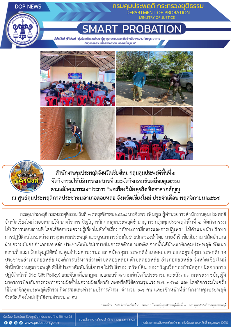 วันที่ 25 พฤศจิกายน 2568 นางจิรพร เพิ่มพูล ผู้อำนวยการสำนักงานคุมประพฤติจังหวัดเชียงใหม่ มอบหมายให้ นางวีราพร ปัญโญ พนักงานคุมประพฤติชำนาญการ กลุ่มคุมประพฤติพื้นที่ 1 จัดกิจกรรมให้บริการนอกสถานที่ โดยได้จัดอบรมความรู้เกี่ยวในหัวข้อเรื่อง "ทักษะการสื่อสารและการปฏิเสธ" ให้คำแนะนำปรึกษาการปฏิบัติตนในระหว่างการคุมความประพฤติ และบูรณาการร่วมกับฝ่ายปกครองนำโดย นายจักรี เขียวใบงาม ปลัดอําเภอฝ่ายความมั่นคง อำเภอดอยหล่อ ประชาสัมพันธ์นโยบายในการต่อต้านยาเสพติด จากนั้นได้นำสมาชิกคุมประพฤติ พัฒนาสถานที่ และปรับปรุงภูมิทัศน์ ณ ศูนย์ประสานงานอาสาสมัครคุมประพฤติอำเภอดอยหล่อและศูนย์คุมประพฤติภาคประชาชนอำเภอดอยหล่อ (องค์การบริหารส่วนตำบลดอยหล่อ) ตำบลดอยหล่อ อำเภอดอยหล่อ จังหวัดเชียงใหม่ ทั้งนี้พนักงานคุมประพฤติ ยังได้ประชาสัมพันธ์นโยบาย ไม่รับสิ่งของ ทรัพย์สิน ของขวัญหรือของกำนัลทุกชนิดจากการปฏิบัติหน้าที่ (No Gift Policy) และขับเคลื่อนกฎหมายและสร้างความเข้าใจกับประชาชน และสังคมตามพระราชบัญญัติมาตรการป้องกันการกระทำความผิดซ้ำในความผิดเกี่ยวกับเพศหรือที่ใช้ความรุนแรง พ.ศ. 2565 และ โดยกิจกรรมในครั้งนี้มีสมาชิกคุมประพฤติเข้าร่วมกิจกรรมและทำงานบริการสังคม จำนวน 18 คน และเจ้าหน้าที่สำนักงานคุมประพฤติจังหวัดเชียงใหม่ปฏิบัติงานจำนวน 4 คน