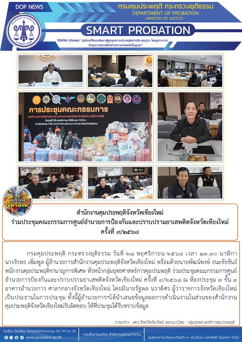 วันที่ 28 พฤศจิกายน 2568 เวลา 13.30 นาฬิกา นางจิรพร เพิ่มพูล ผู้อำนวยการสำนักงานคุมประพฤติจังหวัดเชียงใหม่ พร้อมด้วยนายพัฒน์พงษ์ ธนะชัยขันธ์ พนักงานคุมประพฤติชานาญการพิเศษ หัวหน้ากลุ่มยุทธศาสตร์การคุมประพฤติ ร่วมประชุมคณะกรรมการศูนย์อำนวยการป้องกันและปราบปรามยาเสพติดจังหวัดเชียงใหม่ ครั้งที่ 9/2568 ณ ห้องประชุม 3 ชั้น 3 อาคารอำนวยการ ศาลากลางจังหวัดเชียงใหม่ โดยมีนายรัฐพล นราดิศร ผู้ว่าราชการจังหวัดเชียงใหม่ เป็นประธานในการประชุม ทั้งนี้ผู้อำนวยการฯได้นำเสนอข้อมูลผลการดำเนินงานในส่วนของสำนักงานคุมประพฤติจังหวัดเชียงใหม่รับผิดชอบ ให้ที่ประชุมได้รับทราบข้อมูล