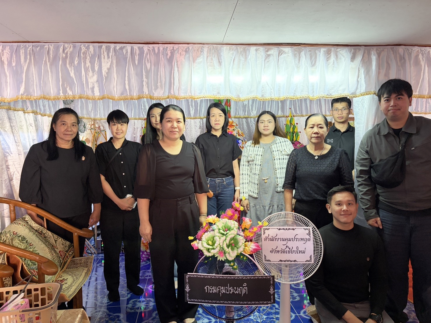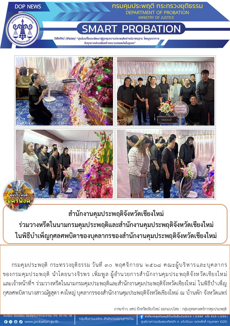 วันที่ 30 พฤศจิกายน 2568 คณะผู้บริหารและบุคลากรของกรมคุมประพฤติ นำโดยนางจิรพร เพิ่มพูล ผู้อำนวยการสำนักงานคุมประพฤติจังหวัดเชียงใหม่ และเจ้าหน้าที่ฯ ร่วมวางหรีดในนามกรมคุมประพฤติและสำนักงานคุมประพฤติจังหวัดเชียงใหม่ ในพิธีบำเพ็ญกุศลศพบิดานางสาวณัฐสุดา คงใหญ่ บุคลากรของสำนักงานคุมประพฤติจังหวัดเชียงใหม่ ณ บ้านพัก จังหวัดแพร่