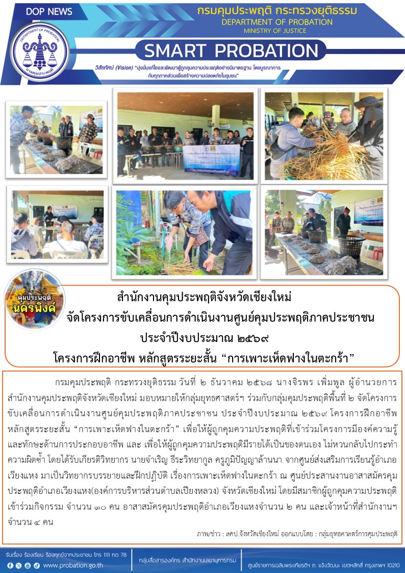 วันที่ 2 ธันวาคม 2568 นางจิรพร เพิ่มพูล ผู้อำนวยการสำนักงานคุมประพฤติจังหวัดเชียงใหม่ มอบหมายให้กลุ่มยุทธศาสตร์ฯ ร่วมกับกลุ่มคุมประพฤติพื้นที่ 2 จัดโครงการขับเคลื่อนการดำเนินงานศูนย์คุมประพฤติภาคประชาชน ประจำปีงบประมาณ 2569 โครงการฝึกอาชีพหลักสูตรระยะสั้น "การเพาะเห็ดฟางในตะกร้า" เพื่อให้ผู้ถูกคุมความประพฤติที่เข้าร่วมโครงการมีองค์ความรู้ และทักษะด้านการประกอบอาชีพ และ เพื่อให้ผู้ถูกคุมความประพฤติมีรายได้เป็นของตนเอง ไม่หวนกลับไปกระทำความผิดซ้ำ โดยได้รับเกียรติวิทยากร นายจำเริญ ธีระวิทยากูล ครูภูมิปัญญาล้านนา จากศูนย์ส่งเสริมการเรียนรู้อำเภอเวียงแหง มาเป็นวิทยากรบรรยายและฝึกปฏิบัติ เรื่องการเพาะเห็ดฟางในตะกร้า ณ ศูนย์ประสานงานอาสาสมัครคุมประพฤติอำเภอเวียงแหง(องค์การบริหารส่วนตำบลเปียงหลวง) จังหวัดเชียงใหม่ โดยมีสมาชิกผู้ถูกคุมความประพฤติ เข้าร่วมกิจกรรม จำนวน 10 คน อาสาสมัครคุมประพฤติอำเภอเวียงแหงจำนวน 2 คน และเจ้าหน้าที่สำนักงานฯ จำนวน 4 คน