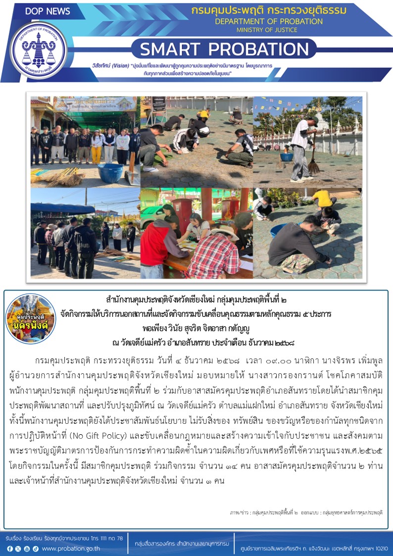 วันที่ 4 ธันวาคม 2568 เวลา 09.00 นาฬิกา นางจิรพร เพิ่มพูล ผู้อำนวยการสำนักงานคุมประพฤติจังหวัดเชียงใหม่ มอบหมายให้ นางสาวกรองกรานต์ โชคโภคาสมบัติ พนักงานคุมประพฤติ กลุ่มคุมประพฤติพื้นที่ 2 ร่วมกับอาสาสมัครคุมประพฤติอำเภอสันทรายโดยได้นำสมาชิกคุมประพฤติพัฒนาสถานที่ และปรับปรุงภูมิทัศน์ ณ วัดเจดีย์แม่ครัว ตำบลแม่แฝกใหม่ อำเภอสันทราย จังหวัดเชียงใหม่ ทั้งนี้พนักงานคุมประพฤติยังได้ประชาสัมพันธ์นโยบาย ไม่รับสิ่งของ ทรัพย์สิน ของขวัญหรือของกำนัลทุกชนิดจากการปฏิบัติหน้าที่ (No Gift Policy) และขับเคลื่อนกฎหมายและสร้างความเข้าใจกับประชาชน และสังคมตามพระราชบัญญัติมาตรการป้องกันการกระทำความผิดซ้ำในความผิดเกี่ยวกับเพศหรือที่ใช้ความรุนแรงพ.ศ.2565 โดยกิจกรรมในครั้งนี้ มีสมาชิกคุมประพฤติ ร่วมกิจกรรม จำนวน 14 คน อาสาสมัครคุมประพฤติจำนวน 2 ท่าน และเจ้าหน้าที่สำนักงานคุมประพฤติจังหวัดเชียงใหม่ จำนวน 1 คน