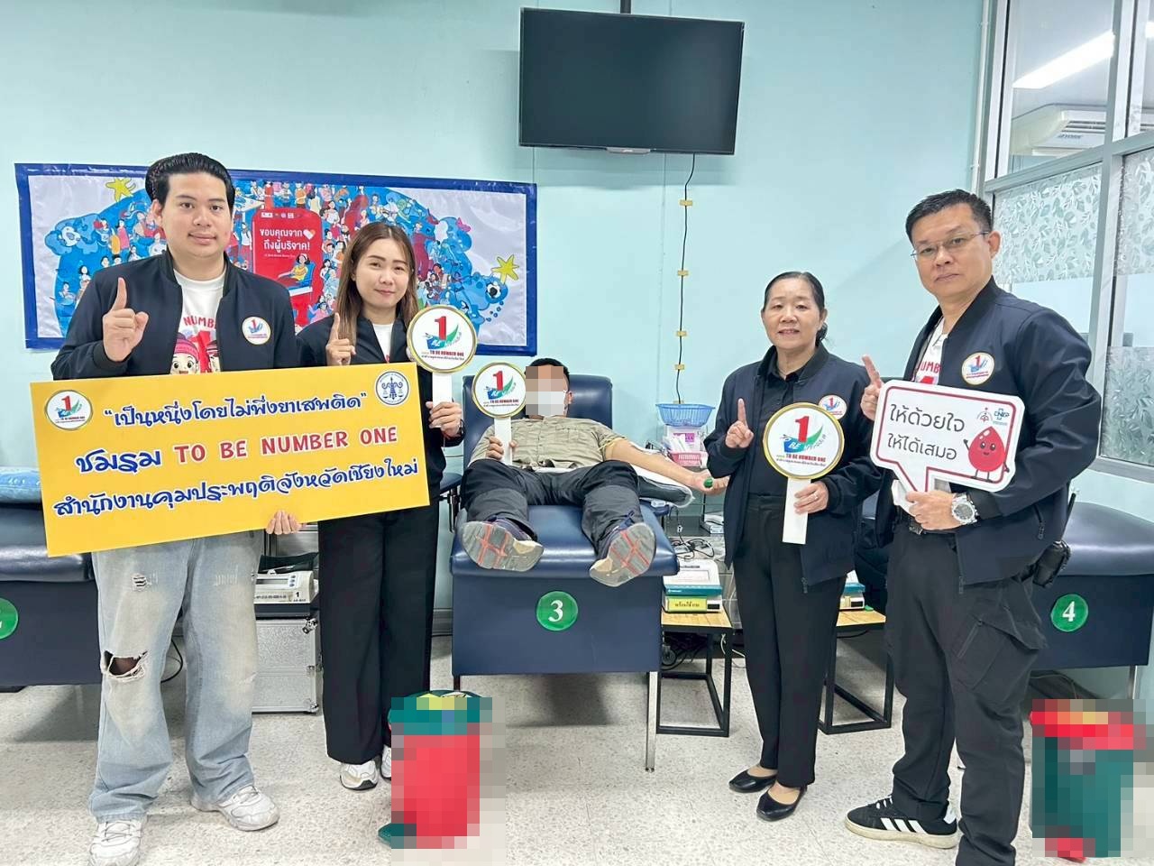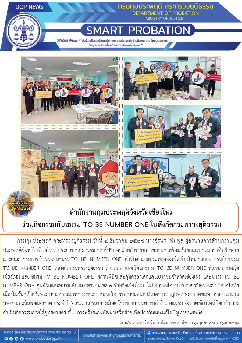 วันที่ 4 ธันวาคม 2568 นางจิรพร เพิ่มพูล ผู้อำนวยการสำนักงานคุมประพฤติจังหวัดเชียงใหม่ ประธานคณะกรรมการที่ปรึกษาฝ่ายอำนวยการชมรมฯ พร้อมด้วยคณะกรรมการที่ปรึกษาฯ และคณะกรรมการดำเนินงานชมรม TO BE NUMBER ONE สำนักงานคุมประพฤติจังหวัดเชียงใหม่ ร่วมกิจกรรมกับชมรม TO BE NUMBER ONE ในสังกัดกระทรวงยุติธรรม จำนวน 3 แห่ง ได้แก่ชมรม TO BE NUMBER ONE ทัณฑสถานหญิงเชียงใหม่ และ ชมรม TO BE NUMBER ONE สถานพินิจและคุ้มครองเด็กและเยาวชนจังหวัดเชียงใหม่ และชมรม TO BE NUMBER ONE ศูนย์ฝึกและอบรมเด็กและเยาวชนเขต 7 จังหวัดเชียงใหม่ ในกิจกรรมโครงการอาสาทำความดี บริจาคโลหิต เนื่องในวันคล้ายวันพระบรมราชสมภพของพระบาทสมเด็จ พระบรมชนกาธิเบศร มหาภูมิพล อดุลยเดชมหาราช บรมนาถบพิตร และวันพ่อแห่งชาติ ประจำปี 2568 ณ ธนาคารเลือด โรงพยาบาลนครพิงค์ อำเภอแม่ริม จังหวัดเชียงใหม่ โดยเป็นการดำเนินกิจกรรมภายใต้ยุทธศาสตร์ ที่ 3 การสร้างและพัฒนาเครือข่ายเพื่อป้องกันและแก้ไขปัญหายาเสพติด