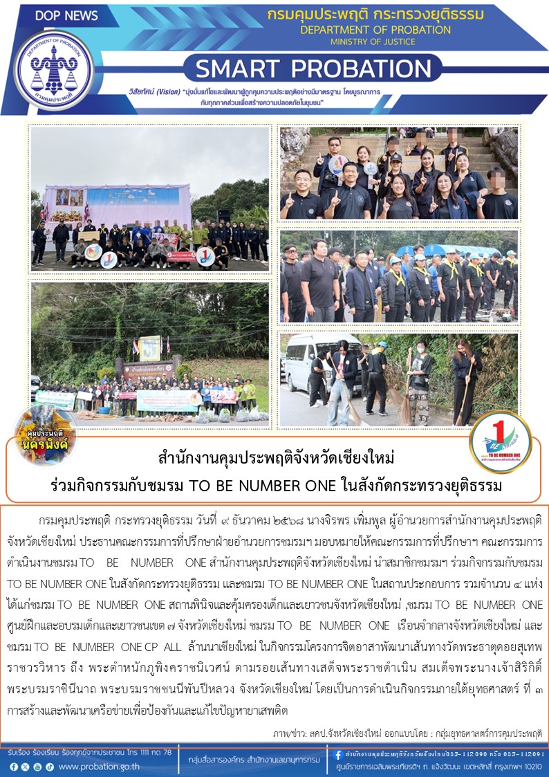 วันที่ 9 ธันวาคม 2568 นางจิรพร เพิ่มพูล ผู้อำนวยการสำนักงานคุมประพฤติจังหวัดเชียงใหม่ ประธานคณะกรรมการที่ปรึกษาฝ่ายอำนวยการชมรมฯ มอบหมายให้คณะกรรมการที่ปรึกษาฯ คณะกรรมการดำเนินงานชมรม TO BE NUMBER ONE สำนักงานคุมประพฤติจังหวัดเชียงใหม่ นำสมาชิกชมรมฯ ร่วมกิจกรรมกับชมรม TO BE NUMBER ONE ในสังกัดกระทรวงยุติธรรม และชมรม TO BE NUMBER ONE ในสถานประกอบการ รวมจำนวน 4 แห่ง ได้แก่ชมรม TO BE NUMBER ONE สถานพินิจและคุ้มครองเด็กและเยาวชนจังหวัดเชียงใหม่ ,ชมรม TO BE NUMBER ONE ศูนย์ฝึกและอบรมเด็กและเยาวชนเขต 7 จังหวัดเชียงใหม่ ชมรม TO BE NUMBER ONE เรือนจำกลางจังหวัดเชียงใหม่ และชมรม TO BE NUMBER ONE CP ALL ล้านนาเชียงใหม่ ในกิจกรรมโครงการจิตอาสาพัฒนาเส้นทางวัดพระธาตุดอยสุเทพราชวรวิหาร ถึง พระตำหนักภูพิงคราชนิเวศน์ ตามรอยเส้นทางเสด็จพระราชดำเนิน สมเด็จพระนางเจ้าสิริกิติ์ พระบรมราชินีนาถ พระบรมราชชนนีพันปีหลวง จังหวัดเชียงใหม่ โดยเป็นการดำเนินกิจกรรมภายใต้ยุทธศาสตร์ ที่ 3 การสร้างและพัฒนาเครือข่ายเพื่อป้องกันและแก้ไขปัญหายาเสพติด