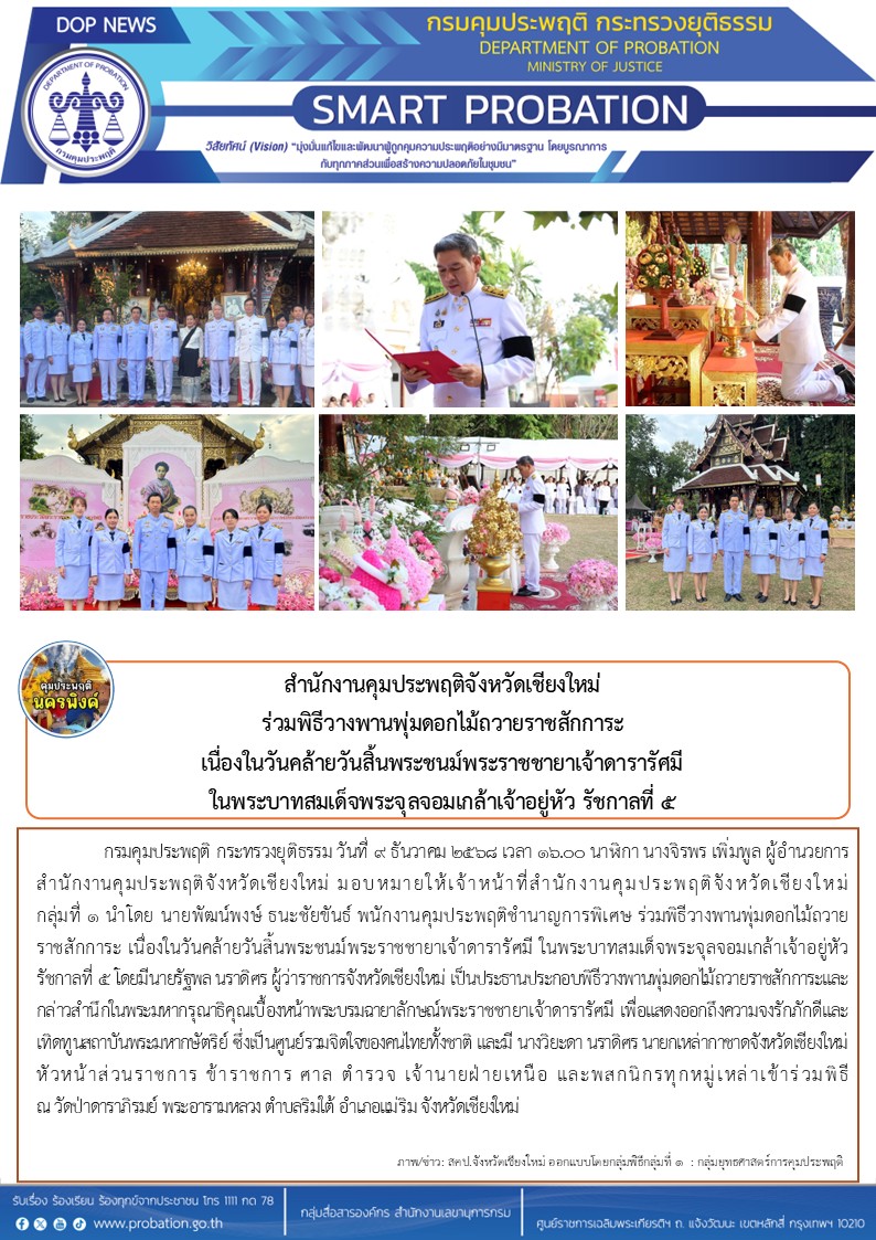 วันที่ 9 ธันวาคม 2568 เวลา 16.00 นาฬิกา นางจิรพร เพิ่มพูล ผู้อำนวยการสำนักงานคุมประพฤติจังหวัดเชียงใหม่ มอบหมายให้เจ้าหน้าที่สำนักงานคุมประพฤติจังหวัดเชียงใหม่ กลุ่มที่ 1 นำโดย นายพัฒน์พงษ์ ธนะชัยขันธ์ พนักงานคุมประพฤติชำนาญการพิเศษ ร่วมพิธีวางพานพุ่มดอกไม้ถวายราชสักการะ เนื่องในวันคล้ายวันสิ้นพระชนม์พระราชชายาเจ้าดารารัศมี ในพระบาทสมเด็จพระจุลจอมเกล้าเจ้าอยู่หัว รัชกาลที่ 5 โดยมีนายรัฐพล นราดิศร ผู้ว่าราชการจังหวัดเชียงใหม่ เป็นประธานประกอบพิธีวางพานพุ่มดอกไม้ถวายราชสักการะและกล่าวสำนึกในพระมหากรุณาธิคุณเบื้องหน้าพระบรมฉายาลักษณ์พระราชชายาเจ้าดารารัศมี เพื่อแสดงออกถึงความจงรักภักดีและเทิดทูนสถาบันพระมหากษัตริย์ ซึ่งเป็นศูนย์รวมจิตใจของคนไทยทั้งชาติ และมี นางวิยะดา นราดิศร นายกเหล่ากาชาดจังหวัดเชียงใหม่ หัวหน้าส่วนราชการ ข้าราชการ ศาล ตำรวจ เจ้านายฝ่ายเหนือ และพสกนิกรทุกหมู่เหล่าเข้าร่วมพิธี ณ วัดป่าดาราภิรมย์ พระอารามหลวง ตำบลริมใต้ อำเภอแม่ริม จังหวัดเชียงใหม่