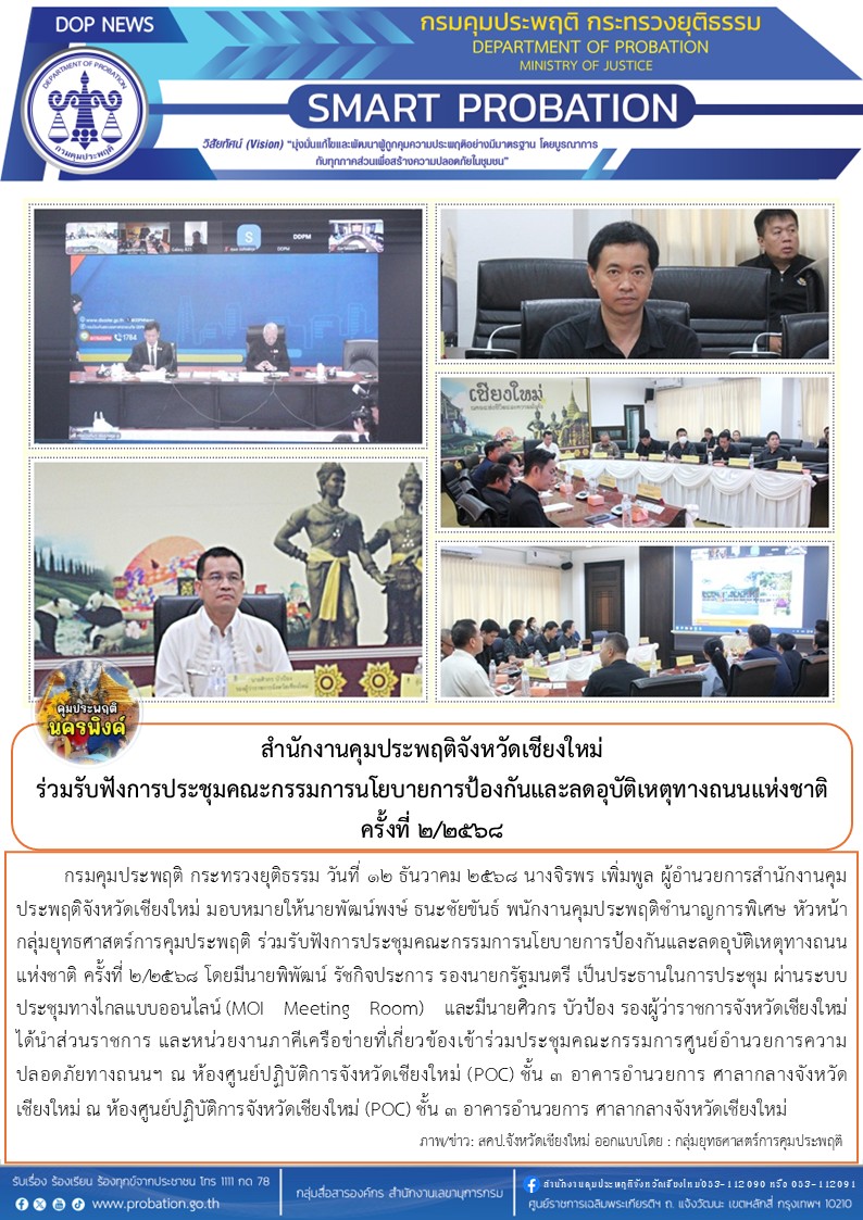 วันที่ 12 ธันวาคม 2568 นางจิรพร เพิ่มพูล ผู้อำนวยการสำนักงานคุมประพฤติจังหวัดเชียงใหม่ มอบหมายให้นายพัฒน์พงษ์ ธนะชัยขันธ์ พนักงานคุมประพฤติชำนาญการพิเศษ หัวหน้ากลุ่มยุทธศาสตร์การคุมประพฤติ ร่วมรับฟังการประชุมคณะกรรมการนโยบายการป้องกันและลดอุบัติเหตุทางถนนแห่งชาติ ครั้งที่ 2/2568 โดยมีนายพิพัฒน์ รัชกิจประการ รองนายกรัฐมนตรี เป็นประธานในการประชุม ผ่านระบบประชุมทางไกลแบบออนไลน์ (MOI Meeting Room) และมีนายศิวกร บัวป้อง รองผู้ว่าราชการจังหวัดเชียงใหม่ ได้นำส่วนราชการ และหน่วยงานภาคีเครือข่ายที่เกี่ยวข้องเข้าร่วมประชุมคณะกรรมการศูนย์อำนวยการความปลอดภัยทางถนนฯ ณ ห้องศูนย์ปฏิบัติการจังหวัดเชียงใหม่ (POC) ชั้น 3 อาคารอำนวยการ ศาลากลางจังหวัดเชียงใหม่ ณ ห้องศูนย์ปฏิบัติการจังหวัดเชียงใหม่ (POC) ชั้น 3 อาคารอำนวยการ ศาลากลางจังหวัดเชียงใหม่