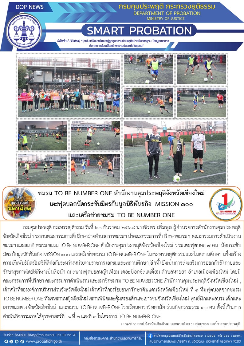 ชมรม TO BE NUMBER ONE สำนักงานคุมประพฤติจังหวัดเชียงใหม่ เตะฟุตบอลนัดกระชับมิตรกับมูลนิธิพันธกิจ MISSION 300 และเครือข่ายชมรม TO BE NUMBER ONE