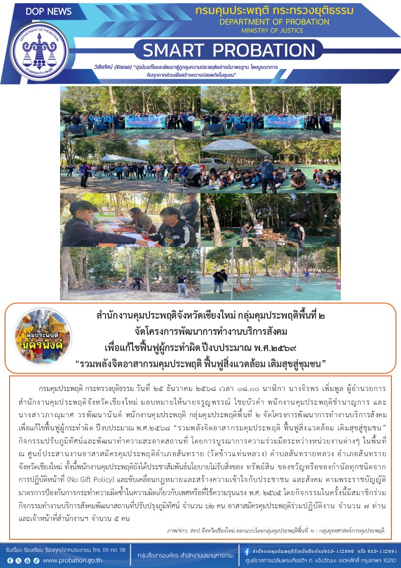 วันที่ 25 ธันวาคม 2568 เวลา 08.00 นาฬิกา นางจิรพร เพิ่มพูล ผู้อำนวยการสำนักงานคุมประพฤติจังหวัดเชียงใหม่ มอบหมายให้นายจรูญพรรณ์ ไชยบัวคำ พนักงานคุมประพฤติชำนาญการ และนางสาวภาณุมาศ วรพัฒนานันต์ พนักงานคุมประพฤติ กลุ่มคุมประพฤติพื้นที่ 2 จัดโครงการพัฒนาการทำงานบริการสังคม เพื่อแก้ไขฟื้นฟูผู้กระทำผิด ปีงบประมาณ พ.ศ.2568 "รวมพลังจิตอาสากรมคุมประพฤติ ฟื้นฟูสิ่งแวดล้อม เติมสุขสู่ชุมชน" กิจกรรมปรับภูมิทัศน์และพัฒนาทำความสะอาดสถานที่ โดยการบูรณาการความร่วมมือระหว่างหน่วยงานต่างๆ ในพื้นที่ ณ ศูนย์ประสานงานอาสาสมัครคุมประพฤติอำเภอสันทราย (วัดข้าวแท่นหลวง) ตำบลสันทรายหลวง อำเภอสันทราย จังหวัดเชียงใหม่ ทั้งนี้พนักงานคุมประพฤติยังได้ประชาสัมพันธ์นโยบายไม่รับสิ่งของ ทรัพย์สิน ของขวัญหรือของกำนัลทุกชนิดจากการปฏิบัติหน้าที่ (No Gift Policy) และขับเคลื่อนกฎหมายและสร้างความเข้าใจกับประชาชน และสังคม ตามพระราชบัญญัติมาตรการป้องกันการกระทำความผิดซ้ำในความผิดเกี่ยวกับเพศหรือที่ใช้ความรุนแรง พ.ศ. 2565 โดยกิจกรรมในครั้งนี้มีสมาชิกร่วมกิจกรรมทำงานบริการสังคมพัฒนาสถานที่ปรับปรุงภูมิทัศน์ จำนวน 62 คน อาสาสมัครคุมประพฤติร่วมปฏิบัติงาน จำนวน 7 ท่าน และเจ้าหน้าที่สำนักงานฯ จำนวน 5 คน