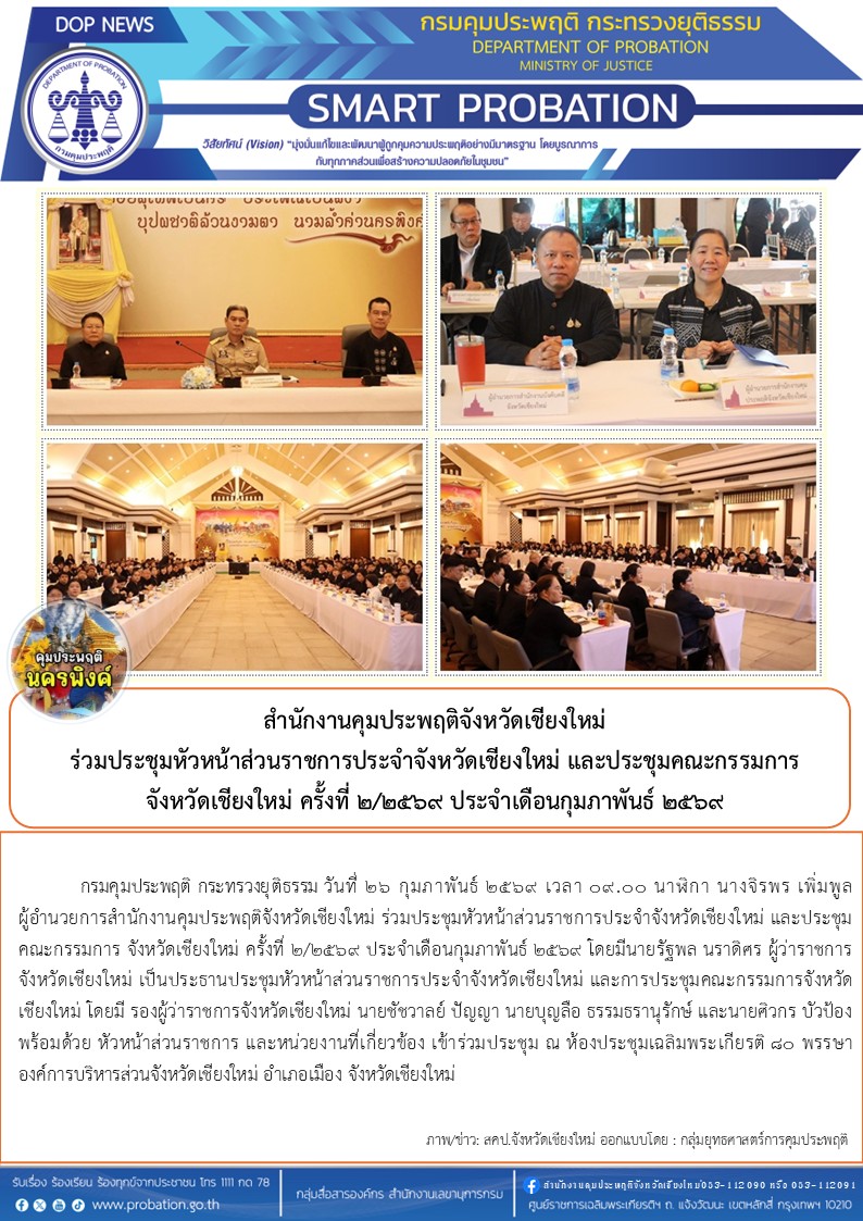 วันที่ 26 กุมภาพันธ์ 2569 เวลา 09.00 นาฬิกา นางจิรพร เพิ่มพูล ผู้อำนวยการสำนักงานคุมประพฤติจังหวัดเชียงใหม่ ร่วมประชุมหัวหน้าส่วนราชการประจำจังหวัดเชียงใหม่ และประชุมคณะกรรมการ จังหวัดเชียงใหม่ ครั้งที่ 2/2569 ประจำเดือนกุมภาพันธ์ 2569 โดยมีนายรัฐพล นราดิศร ผู้ว่าราชการจังหวัดเชียงใหม่ เป็นประธานประชุมหัวหน้าส่วนราชการประจำจังหวัดเชียงใหม่ และการประชุมคณะกรรมการจังหวัดเชียงใหม่ โดยมี รองผู้ว่าราชการจังหวัดเชียงใหม่ นายชัชวาลย์ ปัญญา นายบุญลือ ธรรมธรานุรักษ์ และนายศิวกร บัวป้อง พร้อมด้วย หัวหน้าส่วนราชการ และหน่วยงานที่เกี่ยวข้อง เข้าร่วมประชุม ณ ห้องประชุมเฉลิมพระเกียรติ 80 พรรษา องค์การบริหารส่วนจังหวัดเชียงใหม่ อำเภอเมือง จังหวัดเชียงใหม่